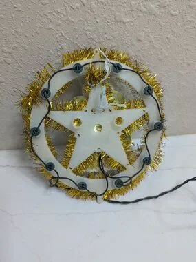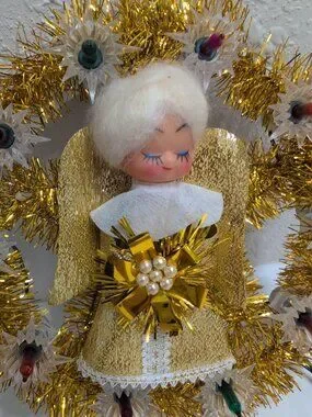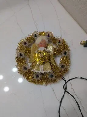 The Vintage Light Up Angel tree topper / decoration / wreath is a charming addition to any holiday decor, featuring a retro design with flashing lights. The gold tinsel material adds a touch of glamour to the Christmas-themed wreath, making it a unique and festive piece for your home. The vintage style and angelic theme of this 7-inch diameter wreath make it a special and nostalgic collectible for the holiday season. Lights likely redone with more modern lights however the plug prongs are both the same size (indicating a little older). All lights work and blink.