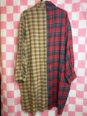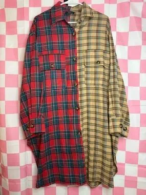 Eye-catching two-tone plaid flannel. Left side red plaid with navy/teal accents. Right side tan plaid with brown/blue lines. Button-front with chest pockets. Casual, statement layering piece.