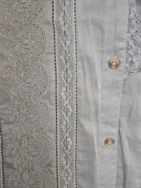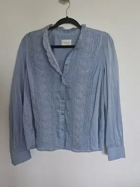 Light blue blouse with delicate lace panels and ruffle trim at the neckline. Button-front closure and long sleeves. Feminine and versatile piece.