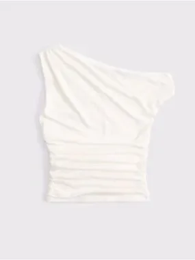 One-shoulder sleeveless tank with asymmetric neckline. Soft white fabric with horizontal ruching at the waist. Clean, minimalist silhouette for easy styling.
