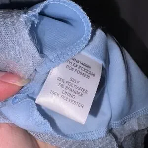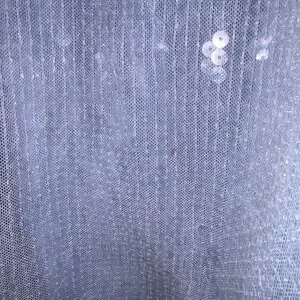 Crystal Doll cocktail dress features a stunning light blue mesh overlay adorned with vertical shimmering threads and scattered sequins. The sleeveless V-neck bodice is accented with delicate satin tie details at the front and back, leading to a deep V-back design. Fully lined for comfort, this sheath-style dress offers a sophisticated yet playful look perfect for parties, homecoming, or special evening events. The intricate sequin placement creates a subtle gradient effect that catches the light beautifully from every angle. Condition is NWOT, though it does have on very small dark spot on one sequin near the bottom, as pictured. Hardly noticeable.