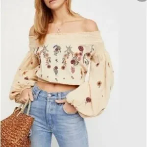 Free People embroidered gauze blouse in a soft cream or light beige hue. This bohemian-style top features intricate floral embroidery across the chest and sleeves, crafted from a breathable 100% cotton crinkle gauze fabric. The design includes a versatile smocked off-the-shoulder neckline, voluminous balloon sleeves with elastic cuffs, and a flattering smocked cropped hemline. Perfect for warm-weather styling with denim or skirts.