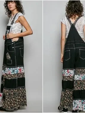 This is a wide leg overall featuring a relaxed, comfortable fit. The legs are designed with layered, ruffled tiers made from mixed printed fabrics, creating a playful and feminine look. The shoulder straps are covered with printed fabric, and the bodice includes decorative trim details, adding a unique and charming touch to the design.