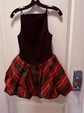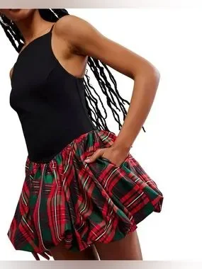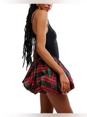 Free People Tinsel Kiss Mini Women's Dress in Black & Red Green Tartan Bubble Skirt size XS Preloved