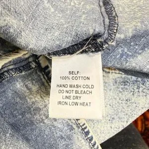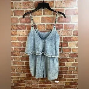 80’s 90’s look acid wash distressed raw edge romper. Has a cropped 2 piece look in a one piece design. Round neck front, v-neck in back. Wide leg short bottom. Absolutely adorable retro summer look