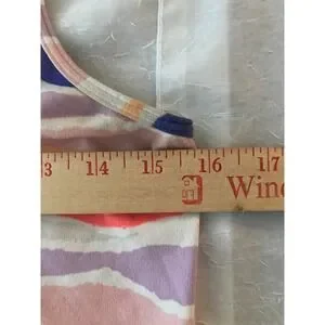 Lululemon abstract stripe print racerback tank top. This athletic top features a vibrant and playful stripe pattern in shades of orange, purple, pink, and blue. The racerback design offers freedom of movement, making it ideal for yoga, running, or everyday active wear. Perfect for hitting the gym or a casual day out. Preowned in good condition. Some signs of wear.