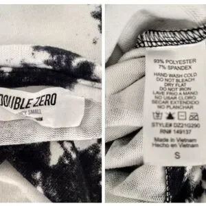 The Double Zero Black and White Tie Dye Pullover Sweatshirt in size Small is a stylish and versatile piece perfect for travel, activewear, and casual occasions. Made from a blended fabric of polyester and spandex, this sweatshirt features a crew neck and long sleeves for added comfort and warmth. The spotted pattern and 60s/70s theme add a fun and retro flair to the design, while the pullover style makes it easy to wear and care for with machine washable instructions. Whether you're hitting the gym or running errands, this sweatshirt is a fashionable choice for the winter, fall, or spring seasons.