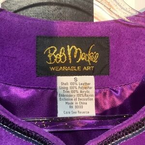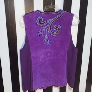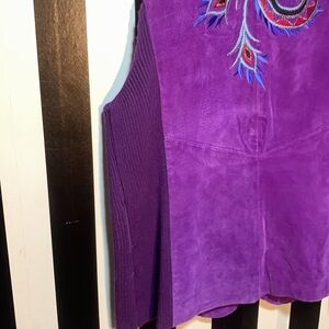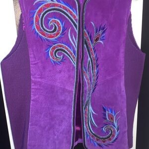 Bob Mackie Wearable Art purple genuine 100 % leather suede vest with embroidered peacock feather detail on front and across shoulders on the back