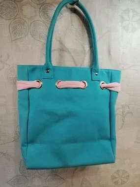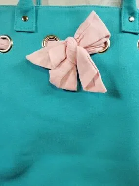 Ralph Lauren shoulder tote in vibrant teal. Features pink bow and tie accents. Gold-tone grommet hardware. Sturdy double handles for shoulder carry. Clean, classic silhouette. 10x4x12 H8"