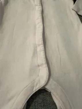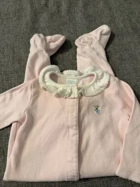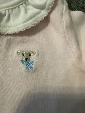 Edgehill Collection Very Soft pink footed one-piece with a ruffled white collar. Front snap closure for easy changes. Tiny embroidered sheep with a blue tie at chest. Long sleeves with scalloped cuffs. Comfortable fabric for sleep and play. GUC for a little piling on feet.