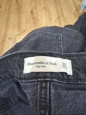High-rise black denim mini skirt by Abercrombie & Fitch. Features silver-tone stud detailing along pockets and side seams. Clean A-line silhouette. Versatile piece for casual or dressed-up looks.