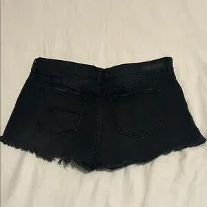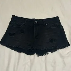 Black denim shorts with distressed details. Frayed hem for a casual look. Low-rise silhouette. Easy to pair with tops and sandals.