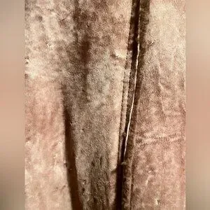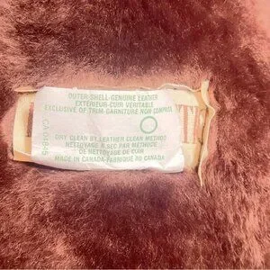 This brown shearling-style coat offers a timeless, worn-in look with relaxed sophistication. Designed with a mid-length silhouette, it combines a leather exterior with synthetic shearling trim for warmth and visual texture. Subtle flecking throughout reflects authentic wear, contributing to its vintage character and lived-in appeal.