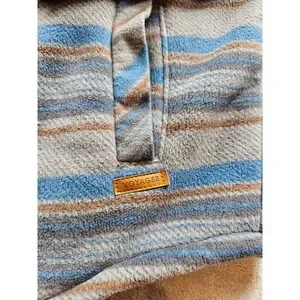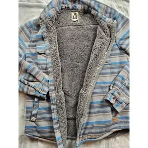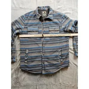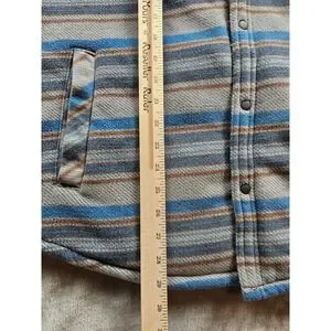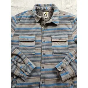 Voyager Shacket Men's Women's Size L Heavy Fleece Outerwear Snap Up Inside Media Pockets Stripes Light Gray Dark Gray Medium Blue Rust/Orange/Brown Outside Pockets Chest Pockets with Snaps Pre-Owned Good Condition (See Photos For Measurements)