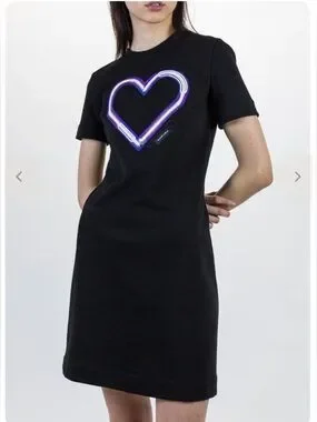 Sleek black thick tee dress with a bold purple heart graphic on the chest. Simple crew neckline and short sleeves. Easy statement piece for casual looks.