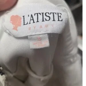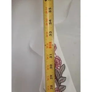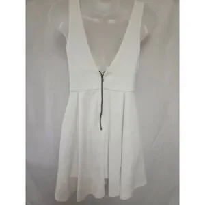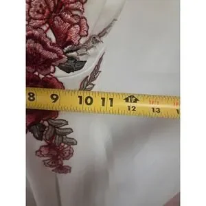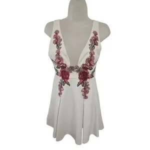 Captivate with this stunning L'ATISTE BY AMY white dress, adorned with vibrant floral embroidery that artfully frames a daring deep V neckline. The exquisite red and pink rose motifs, accented by delicate green leaves, create a breathtaking centerpiece that draws the eye. A flattering fitted waist gives way to a playful, flared skirt, perfect for dancing the night away or making a memorable entrance. The discreet back zipper ensures a seamless look, highlighting the dress's elegant silhouette. This piece is ideal for a romantic garden party, a chic wedding guest ensemble, or a sophisticated evening out.