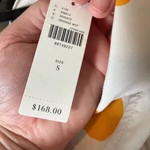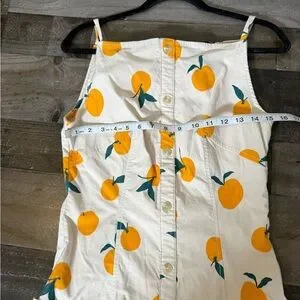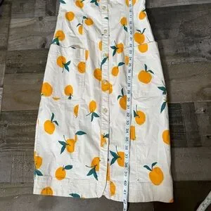Effortlessly charming Anthropologie dress designed by Dylan Mierzwinski for Maeve. This sleeveless midi features a playful orange fruit print on a soft ivory base, thin straps, and a flattering tailored silhouette. Button-front design with functional patch pockets adds both charm and practicality. A perfect statement piece for spring and summer — brunch, vacations, or casual events.