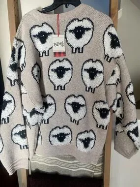 Playful crewneck sweater with repeated sheep pattern. Beige base with black and white sheep details. Soft textured knit and ribbed neckline, cuffs, and hem. Casual and cozy for everyday wear. Woolrich x Target Collaboration.