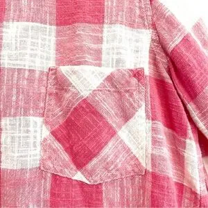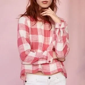 Anthro Cloth and Stone Cotton Linen Button-Back Gingham Blouse Pink White XL