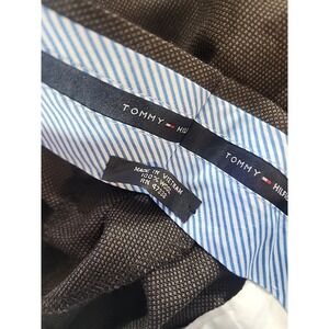 The Tommy Hilfiger Lowry Suit for men is a stylish and classic 2-piece set made from 100% Worsted Wool in a sophisticated brown color. This suit features a regular jacket with a striped pattern, a flat front, double-vented back, and a two-button single-breasted closure. The trousers have a 35.5-inch waist and a 30-inch inseam, making them suitable for various occasions such as travel, parties, or business meetings. With its timeless preppy style and quality construction, this Tommy Hilfiger suit is a versatile addition to any man's wardrobe.