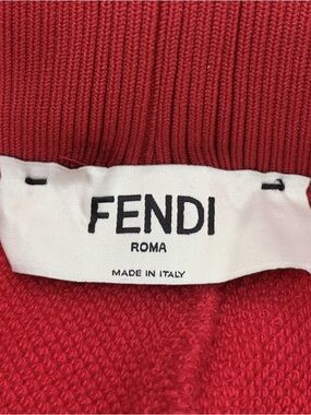Bold red joggers with black Fendi logo tape down both sides. Elastic waistband and ribbed ankle cuffs. Sporty designer silhouette.