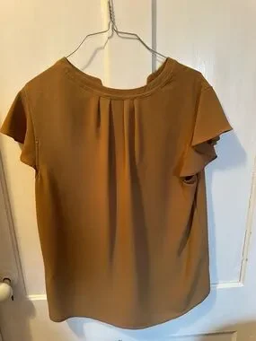 Calvin Klein short-sleeve blouse in a warm mustard tone. Textured lightweight fabric with a subtle pleat at the front. Split V-neck adds a polished touch. Relaxed, easy silhouette for versatile wear.