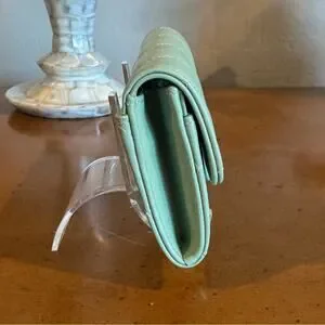 Ultra-rare CHANEL Classic Flap card holder in light green quilted lambskin with black hardware. Iconic CC snap flap design with compact interior for cards and folded bills. Highly sought-after colorway and collectible small leather good.