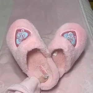 Soft plush Barbie slippers with embroidered heart logos. Light blue and silver accents on the fronts. Slip-on style with cushioned interior. Cute and cozy design.