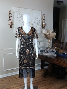 #New Women's Black And Gold Sequin Beaded Flapper Cocktail Dress. #Large Size