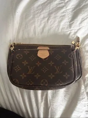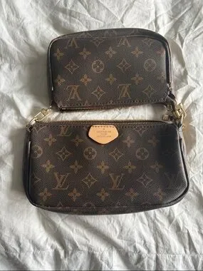 Louis Vuitton double pouch crossbody in classic monogram canvas.