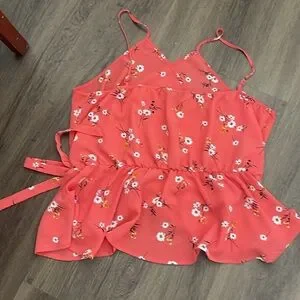 Pink blouse picturing with yellow, red & brown flowerss colors 98% polyester & 2% spandex. Good condition. (Box 18)