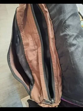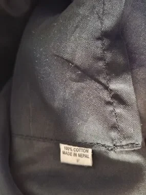 Handcrafted boho-style crossbody bag with vibrant purple fabric and multicolor appliqué details. Features green floral patches and red fabric rosettes for a playful look. Lightweight and versatile for everyday use. Stylish purple color complements casual and festival outfits. Two zippers and an inner pocket. 100% cotton. Nepal.