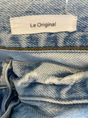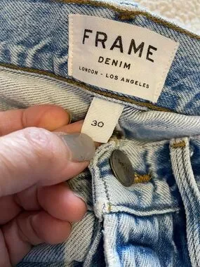 These are Frame "Le Original" button fly straight-leg jeans in a distressed light wash
