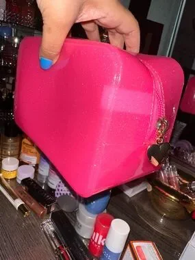21pc Assortment Of Makeup, Skincare, Haircare, & Pink Jelly Glitter Pouch with Gold Heart Zipper Pull.