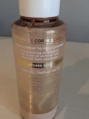 Lightweight shimmer oil for a luminous glow. Vanilla orchid and sandalwood scent. Smooth application with subtle sparkling finish.