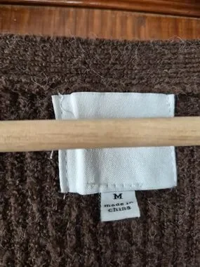 Open-front knit cardigan with long sleeves. Two front patch pockets. Cozy, relaxed silhouette for layering. Neutral brown tone pairs with many outfits.