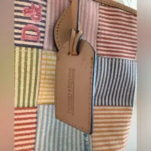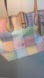 Stylish pastel patchwork tote in pink, yellow, green, blue and cream with tan leather handles and trim.