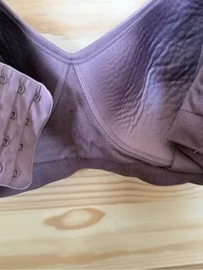 Soft mauve wireless bralette with gentle stretch fabric. Smooth cups for discreet shaping. Adjustable straps with easy nursing clips. Wide elastic band offers light support. Lightweight and breathable for daily wear.