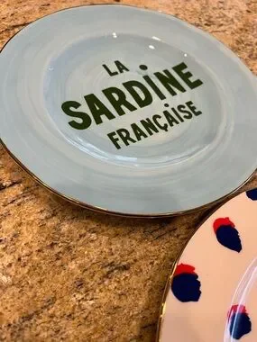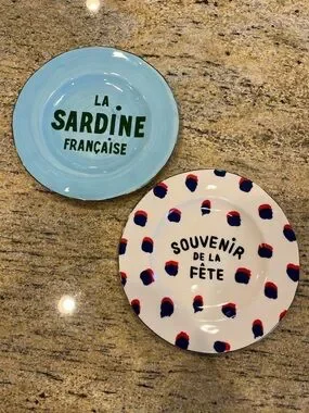 Two dessert Anthropologie plates. One white with blue and red dot pattern and black text. One aqua plate with green text and gold rim. Bright, playful design. They are 8.5” in diameter.