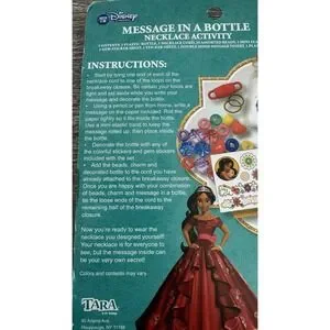 The NEW Disney Elena Of Avalor Message in a Bottle Necklace Activity includes stickers and beads for kids to craft their own personalized necklaces. This Disney-themed craft kit allows children to create unique designs inspired by the popular TV show, Elena of Avalor. The set includes everything needed to make a special necklace, making it a fun and creative activity for young fans of the show. This craft kit is sure to provide hours of entertainment and fond memories for young crafters.