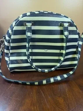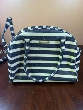 Chic kate spade dome satchel with bold horizontal stripes. Dual top handles and a detachable wrist/shoulder strap. Gold-tone logo and hardware accents. Structured silhouette for everyday use. Folks please note the ink markings on side. Can’t really see it from far. In effort to be transparent. Other than that looks real good
