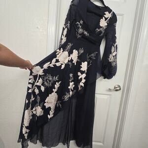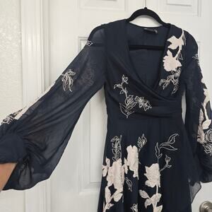 Sheer long sleeves with a V-neckline. Fitted waist and flowing midi skirt. White floral embroidery throughout. Side slit adds movement.