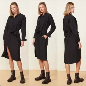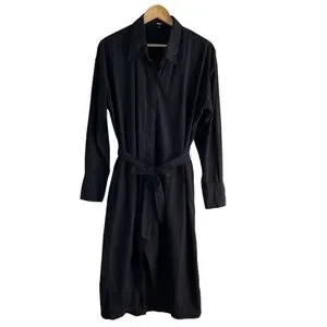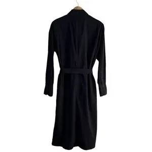Features: midi length, collard top with asymmetrical full front button closure, thigh slit, waist tie, side pockets, relaxed fit. Color: black.