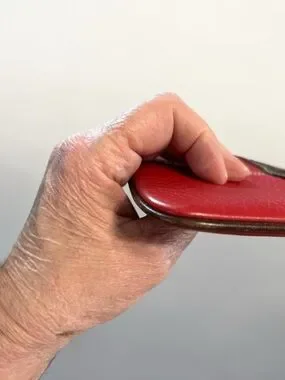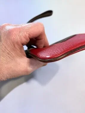 Compact leather wristlet with key ring and card slot. Pebbled red leather with contrasting dark trim and stitched wrist strap. Secure zip closure and easy grab strap. Elegant everyday accessory by Dooney & Bourke.