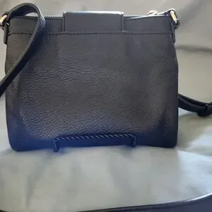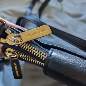 Sleek Michael Kors crossbody bag in pebbled leather. Features a prominent gold MK logo accent. Single zip top and slim strap for easy wear. Timeless, versatile design for everyday use.