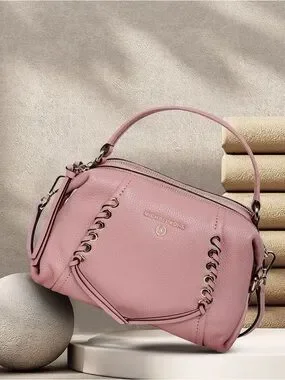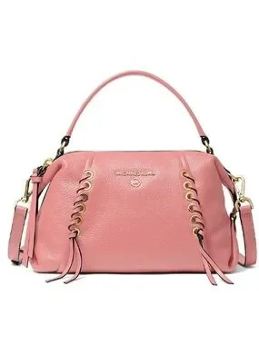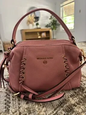Michael Kors satchel in blush pink leather. Top handle with detachable shoulder strap. Gold-tone hardware and eyelet lace-up detailing. Structured silhouette with soft pebbled texture. Polished logo plaque at front.