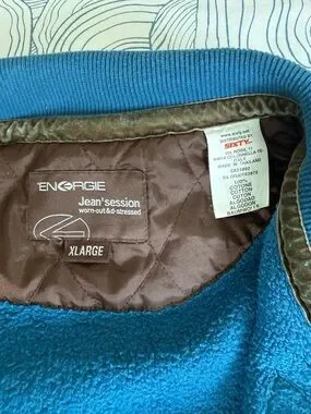 Energie jacket. VINTAGE circa 2002. Branded label detail at interior. Casual, warm outer layer for everyday wear.