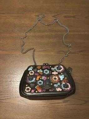 Coach Black Leather Floral Appliqué Crossbody with Chain Strap
