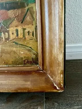 Signed village landscape painting in a rustic brown frame. Warm brown and gold tones create a cozy, classic look. Ready to display as focal home art. A timeless accent that complements traditional and rustic decor. Size is 13/15 inches