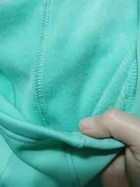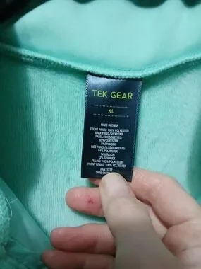 Tek Gear hooded quilted jacket in a soft mint green. Front zip closure. Long sleeves and panel detailing. Smooth fleecy soft interior and lightweight warmth. It has the thumb holes for warm hands.